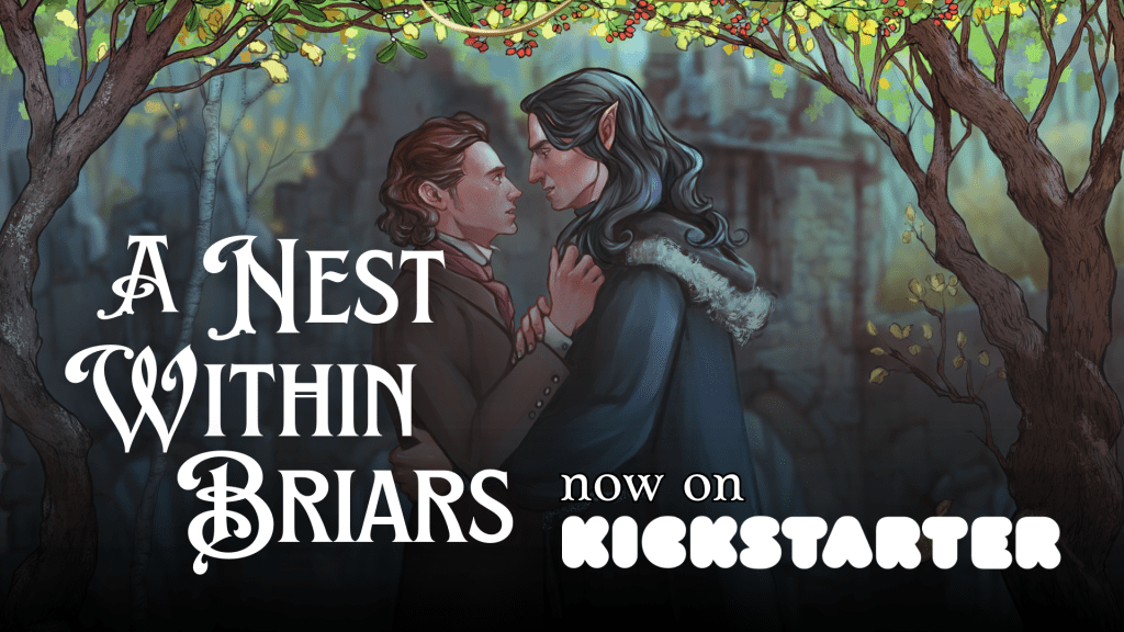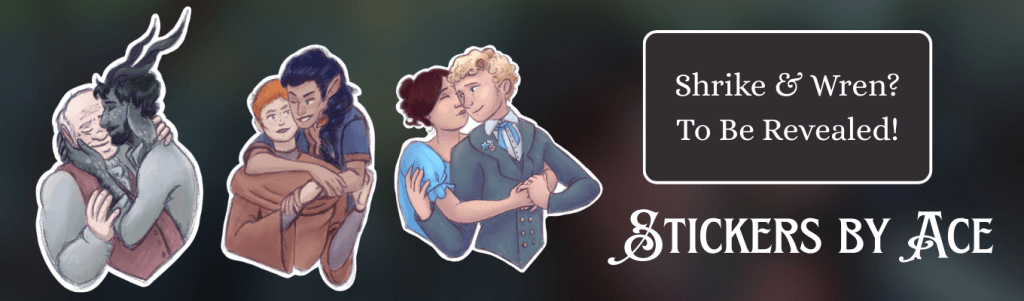 In addition to ebook and paperback editions of A Nest Within Briars, the Kickstarter will also feature stickers designed by Ace (they/them). They’ve created wonderful couples portraits of Ephraim and Hullvardr, Daniel and Sukie, Nell and Everilda, and soon… Shrike and Wren? Check out more of their work on Instagram, @_art_by_ace_