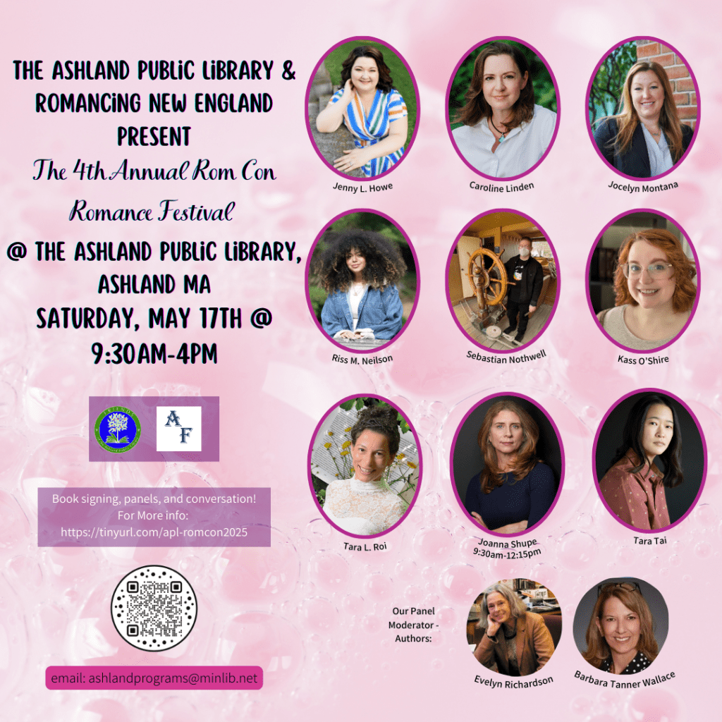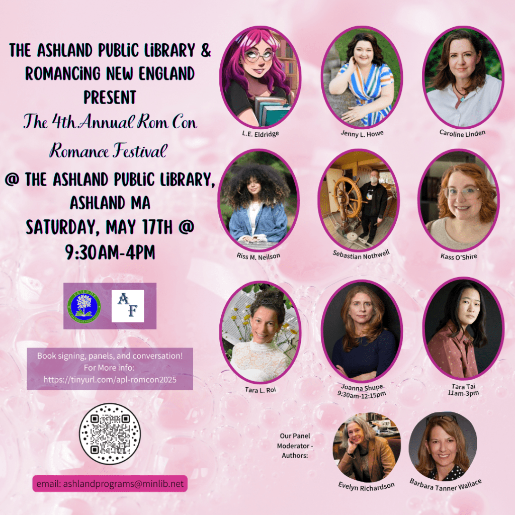 Come join us on Saturday, May 17th for the 4th Annual RomCon – Romance Authors Festival – at the Ashland Public Library! Meet some of your favorite romance authors, get signed books, listen in on panels, play along with romance jeopardy, and mingle with other romance lovers. It’s going to be a fabulous day!