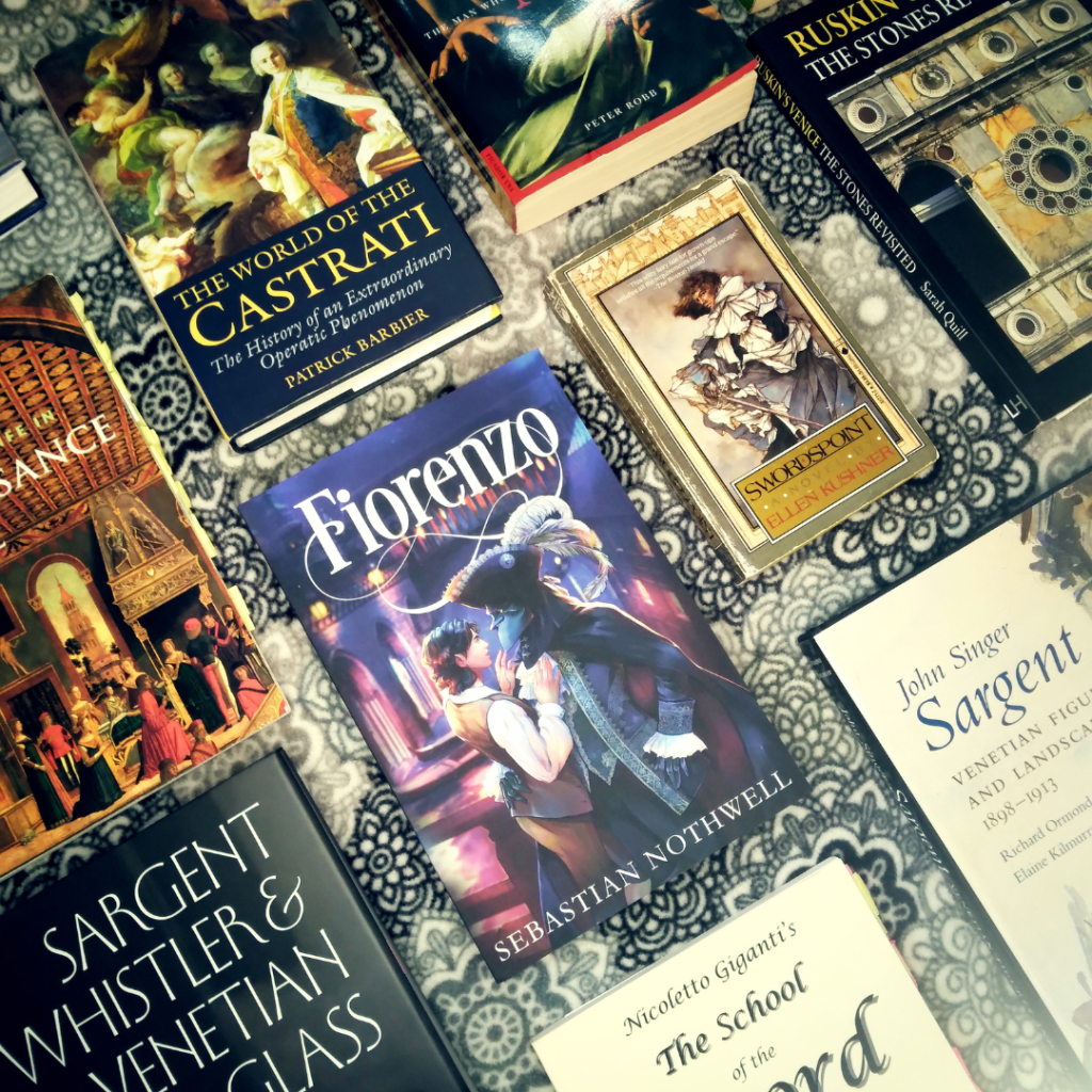 FIORENZO is a queer fantasy-of-manners romance featuring hurt/comfort, swordplay, and a happily-ever-after. And it’s finally out in paperback! Shown here with some of the books that inspired it.